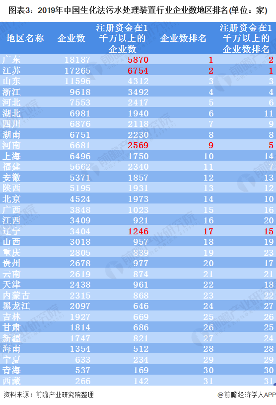 值得注意的是,排名第一的廣東省共有18187家新成立企業,但是它的注冊資金在1千萬以上的企業數(5870家)卻不如排名第二的江蘇省(6754家)。因此,可以看出雖然廣東省有18187家企業但是江蘇省(17265家)才是中國生化法污水處理裝置行業主要集中地。此外,河南省和遼寧省也是同樣的情況,雖然企業數排名較后,但是其注冊資金在1千萬以上的企業數排名卻比新成立企業數排名較為靠前。