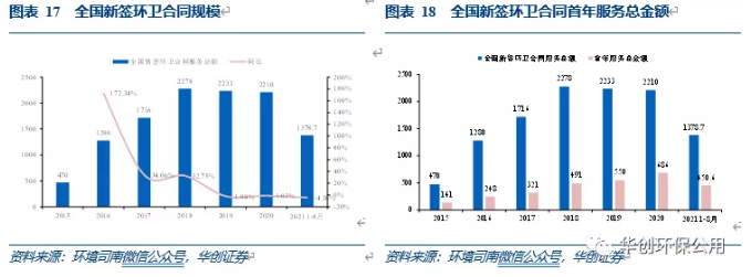 2020年,我國環衛行業新簽合同規模達到2210億元,同比下降1.03%。首年服務總金額達到686億元,同比增長24.73%。2021年1-8月,全國新簽環衛合同總額為1378.7億元,同比下降4.26%,首年服務總金額450.6億元。