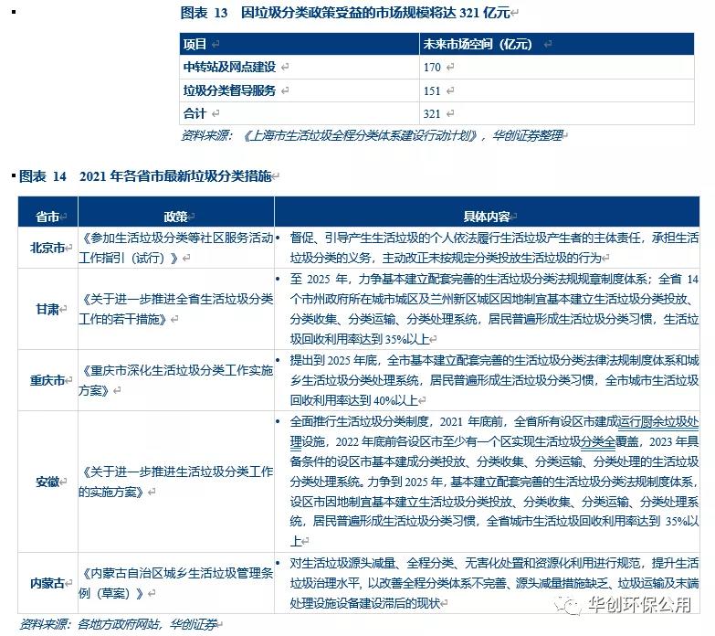 垃圾分類政策頻出,因政策受益的市場規模約321億。2020年11月,住房和城鄉建設部等部門印發《關于進一步推進生活垃圾分類工作的若干意見》的通知,明確力爭再用五年左右時間,在地級及以上城市因地制宜基本建立生活垃圾分類投放、分類收集、分類運輸、分類處理系統。2019年6月,住房和城鄉建設部等部門出臺了《關于在全國地級及以上城市全面開展生活垃圾分類工作的通知》,明確了“以建立46個重點城市垃圾分類處理系統為第一步,并逐步實現全國地級及以上城市的生活垃圾分類處理系統的建設”目標。我們認為垃圾分類政策的進一步推進和落實有望顯著帶動垃圾中轉站、回收網點和督導、清運服務需求的提升,未來市場空間約321億元。