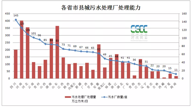 四川、山東、安徽等省市鄉鎮污水處理廠數量排名靠前,其中四川省最多,達2211個,處理能力為219萬立方米/日,鄉鎮污水處理裝置處理能力為276萬立方米/日。從污水廠處理能力來看,排行靠前的是廣東、江蘇、山東等地,分別為623萬立方米/日、476萬立方米/日、370萬立方米/日等。