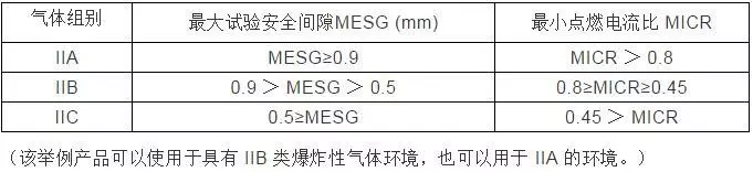ii類隔爆型電氣設(shè)備或本質(zhì)安全型電氣設(shè)備,按其適用于爆炸性氣體混合物的最大試驗安全間隙或最小點燃電流比,進一步分為iia、iib和iic類。如下表所示。