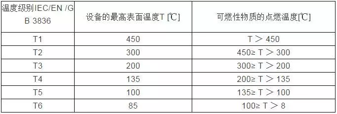 電氣設(shè)備按其最高表面溫度分為t1~t6組,使得對應(yīng)的t1~t6組的電氣設(shè)備的最高表面溫度不能超過對應(yīng)的溫度組別的允許值。溫度組別、設(shè)備表面溫度和可燃性氣體或蒸汽的引燃溫度之間的關(guān)系如下表所示: